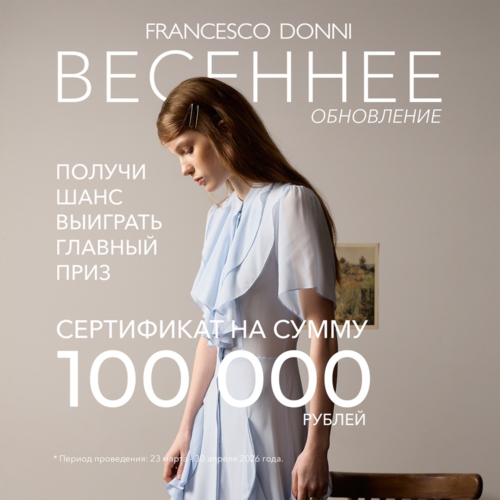 Для участия в акции в период с 25 марта 2026 по 30 апреля 2026 года совершите единовременную покупку от 10 000 рублей в розничном магазине Francesco Donni и зарегистрируйте чек.