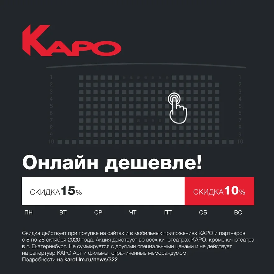 С 8 по 28 октября при покупке билетов в кинотеатр КАРО через сайт karofilm.ru, фирменное онлайн-приложение и сайты партнеров зрителям предоставляется скидка в размере 15% в будние дни и 10% в выходные.