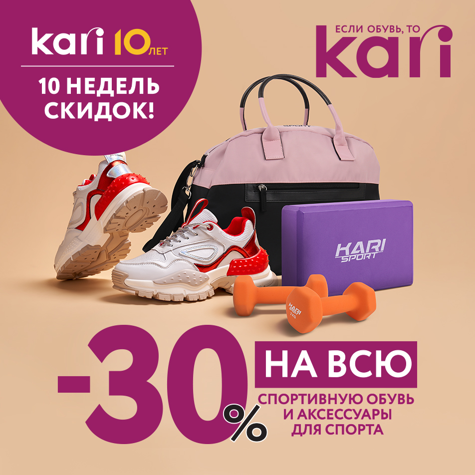 В первую неделю акции во всех магазинах KARI будут действовать скидки на спортивную ассортимент. Обувь, одежда, инвентарь для занятия спортом – со скидкой 30%.