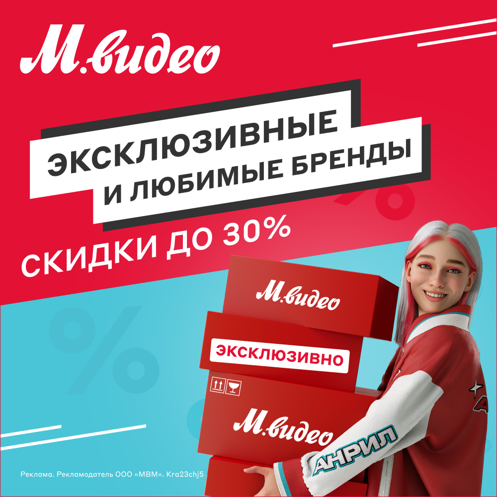 В период с 25.07.2023 г. по 14.08.2023 г. включительно во всех магазинах «М.Видео», включая интернет-магазин (покупки, совершенные на сайте www.mvideo.ru, в мобильном приложении, а также через операторов контакт-центра), будет проходить рекламная акция «Скидки на эксклюзивные бренды до 30%».