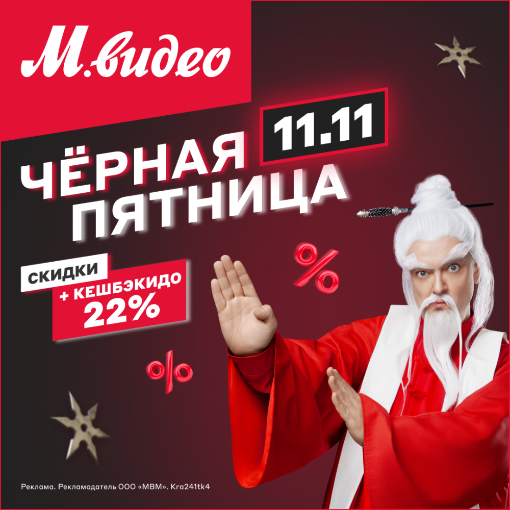 В период с 07.11.2023 г. и по 20.11.2023 г. включительно во всех магазинах «М.Видео», включая интернет-магазины (покупки, совершенные на сайте www.mvideo.ru и в мобильном приложении), будет проходить рекламная акция «Чёрная пятница 11.11».